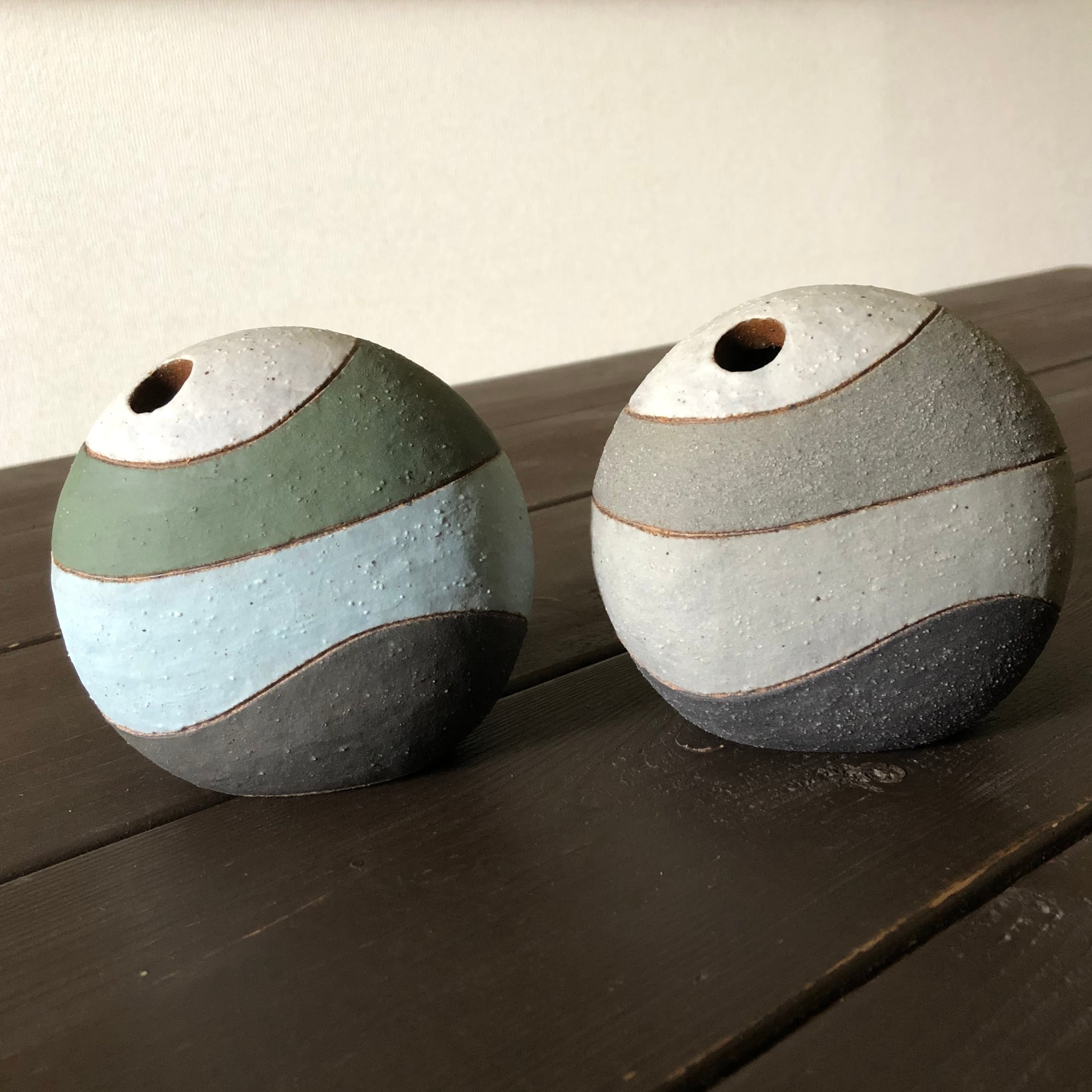 無地の焼きしめだっり、釉薬がかかっているものだったり。